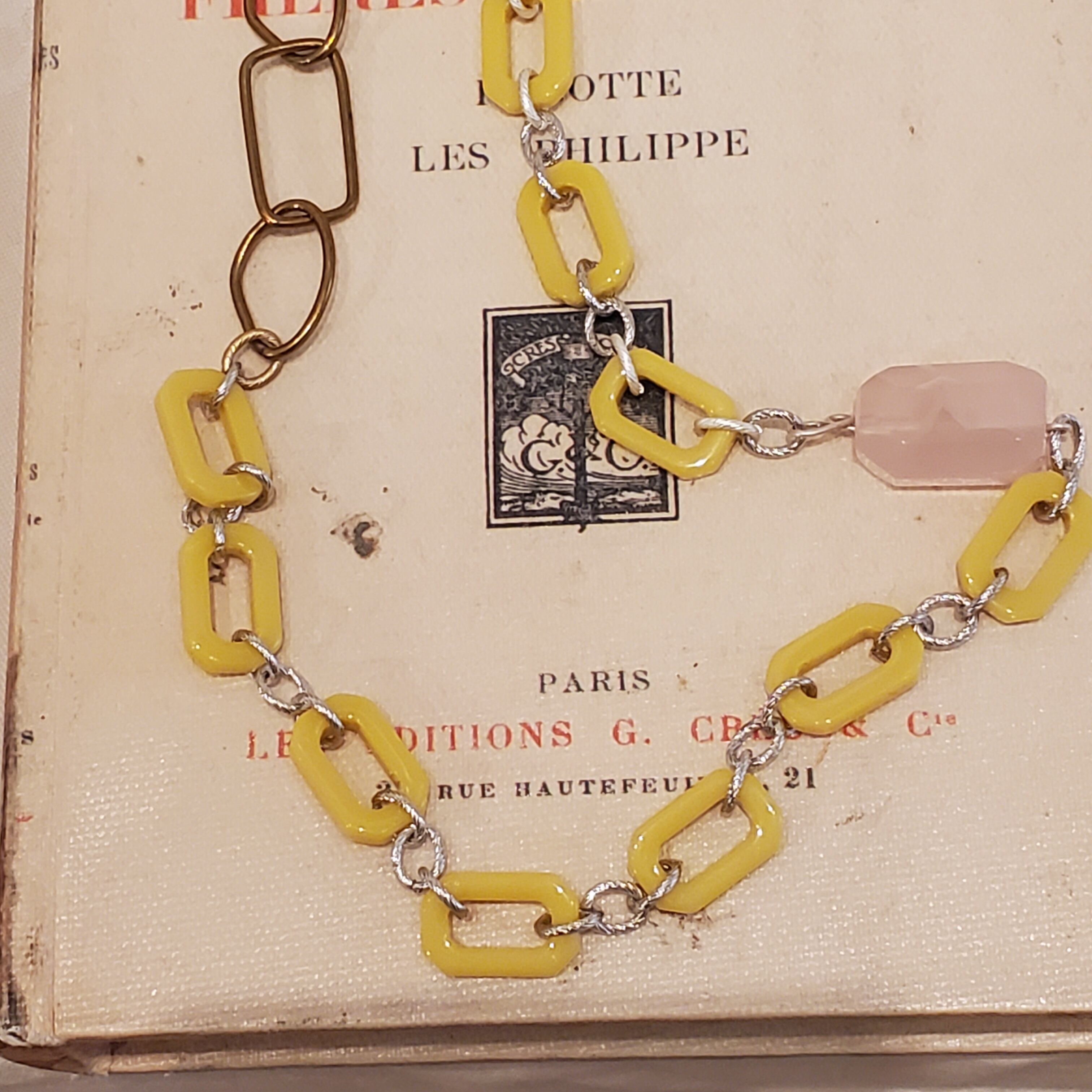 イタリアヴィンテージのマスタードイエローとローズクォーツの組み合わせは暖かさを感じるネックレスとなっております。