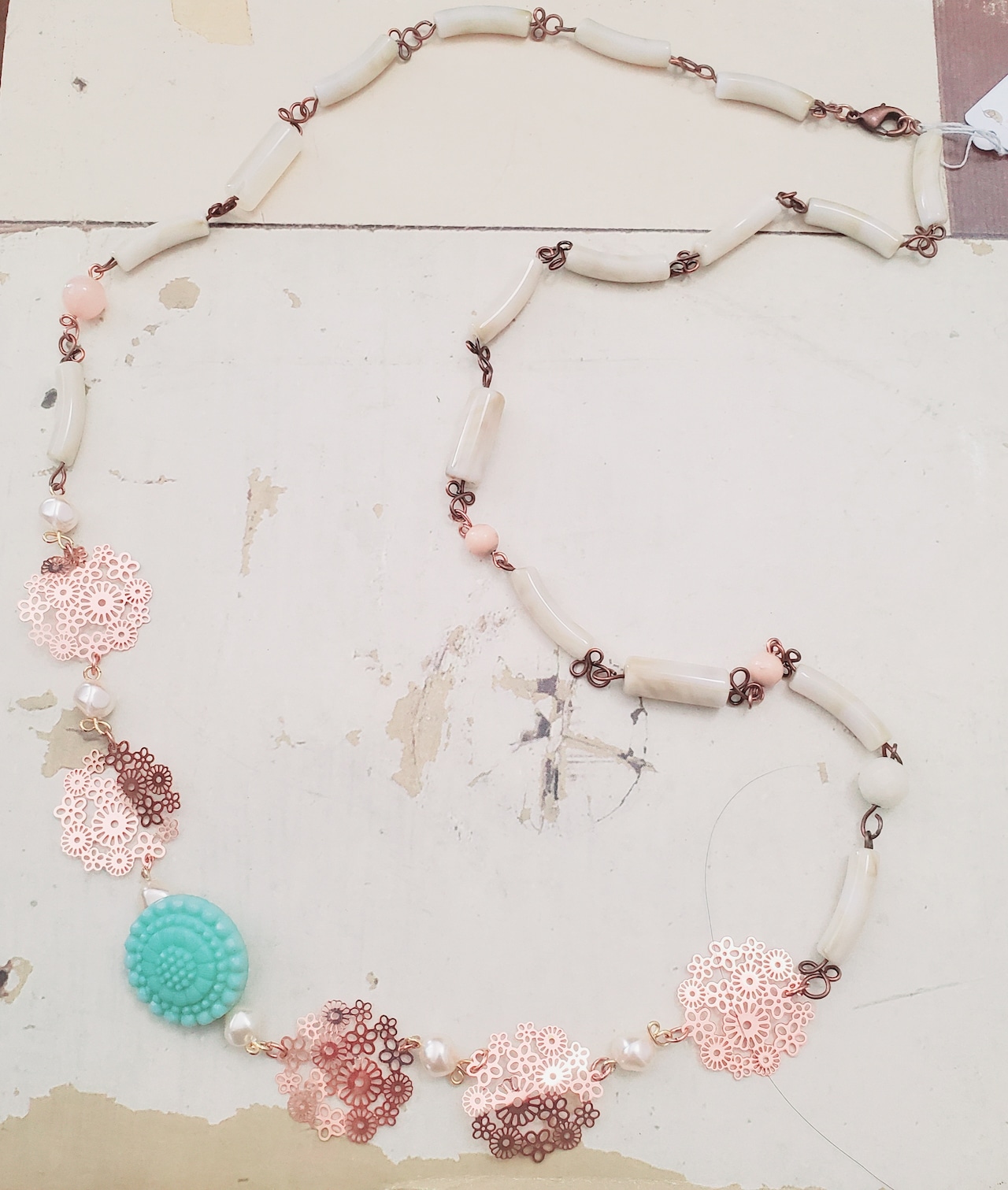 淡いブルーグリーンのヴィンテージボタンとピンクゴールドのメタルが桜のお花のようなネックレス