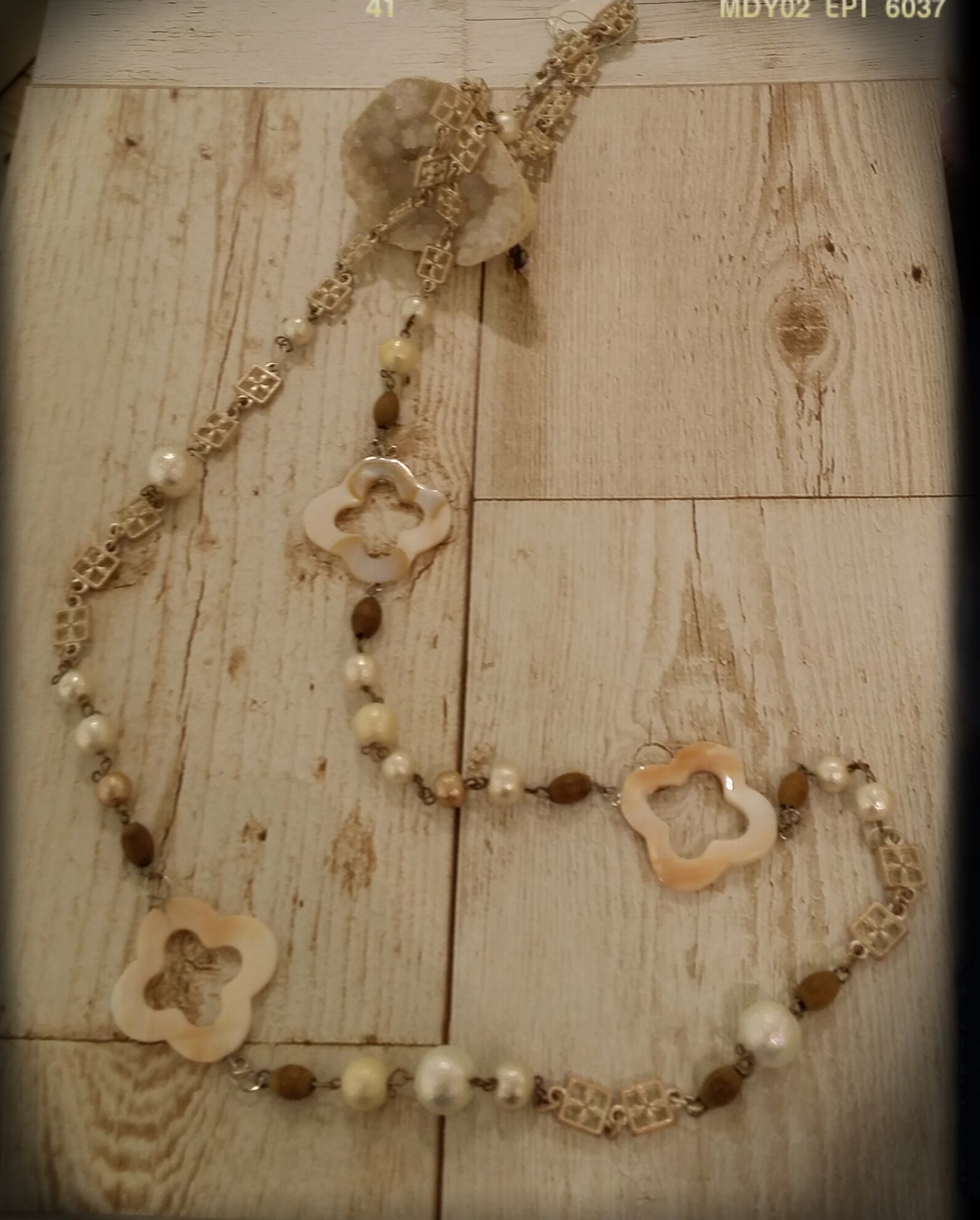 素材:マザーオブパール、フランスヴィンテージウッドビーズ、コットンパール、真鍮